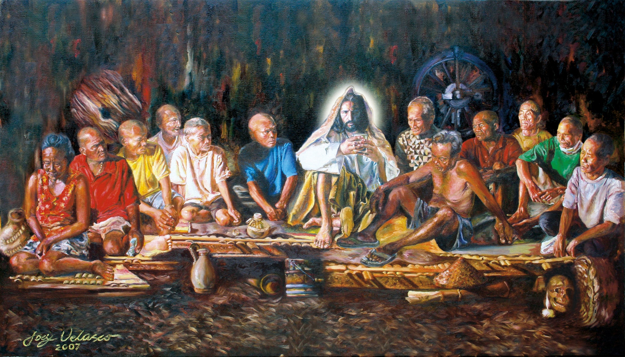 Just as I was completing the last strokes of this painting this morning, two of my subjects in this latest obra were being riddled with bullets while cultivating their own land somewhere in Central Philippines: Mang Alejandro (fourth from right) and Mang Eli (second from left). They are with us no more. Last March, we attended Mass under their worn-out tent. I felt their sighs: "Ginoo, thank you for journeying with us through the valley of darkness... kalakbay."