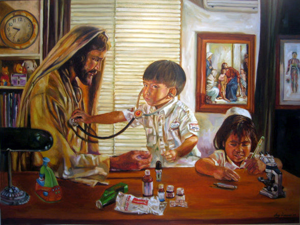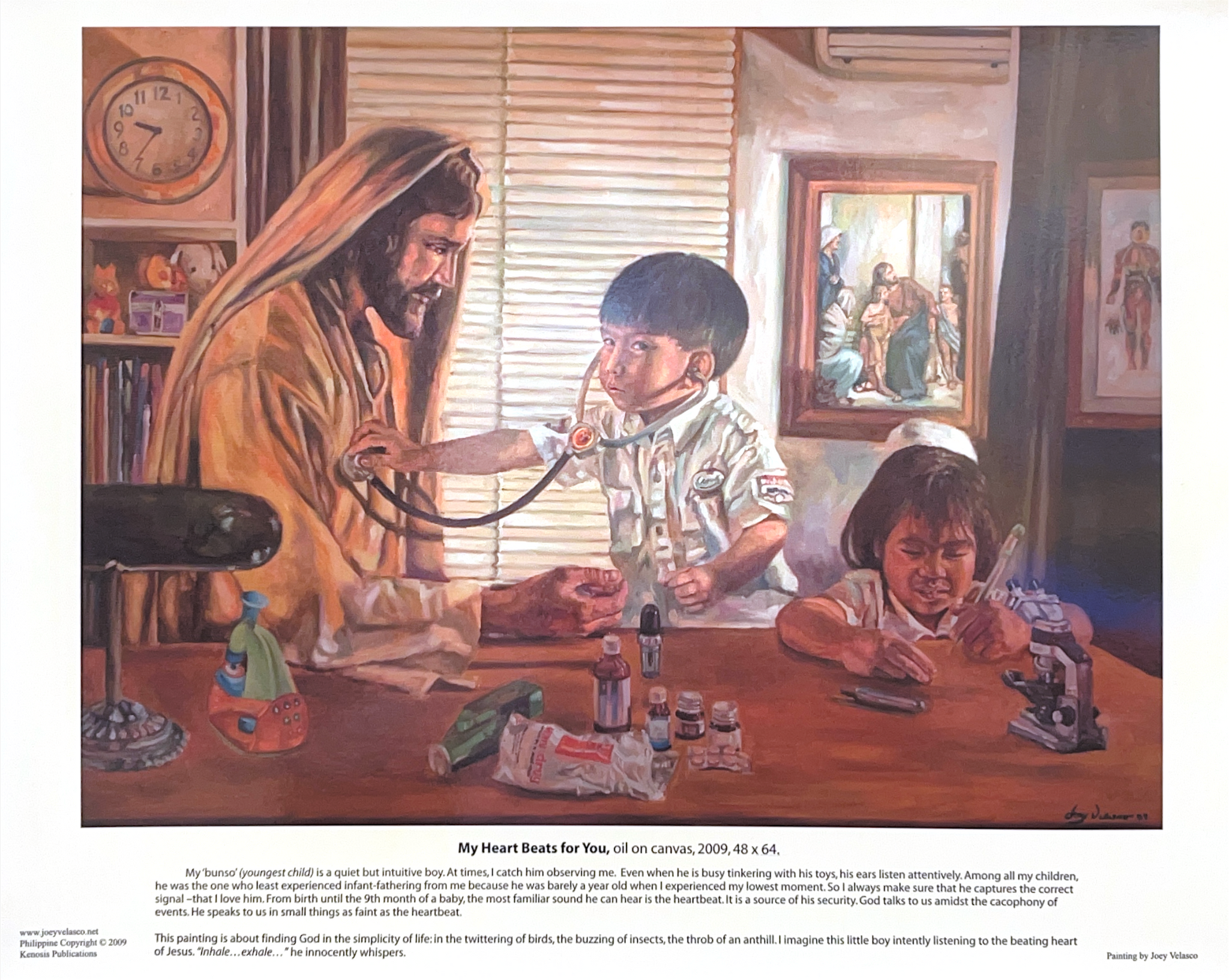 This painting is about finding God in the simplicity of life: in the twittering of birds, the buzzing of insects, the throb of an anthill. I imagine this little boy intently listening to the beating heart of Jesus. "Inhale... exhale..." he innocently whispers.